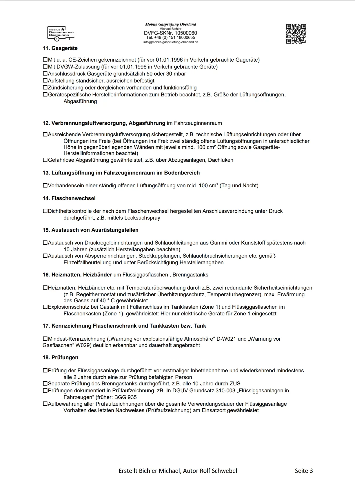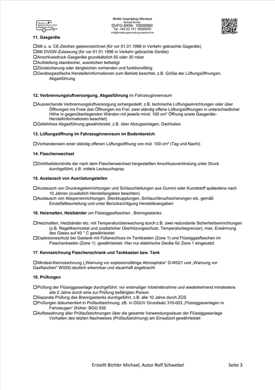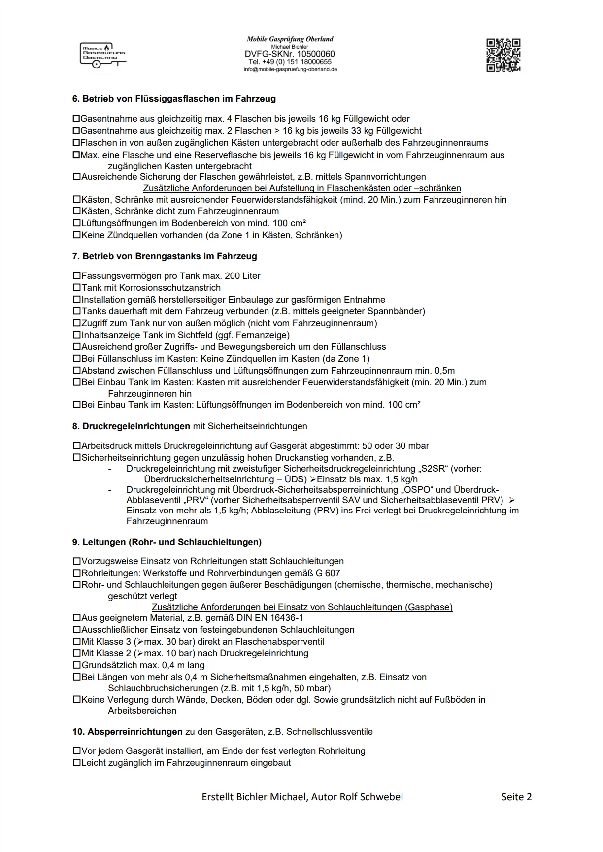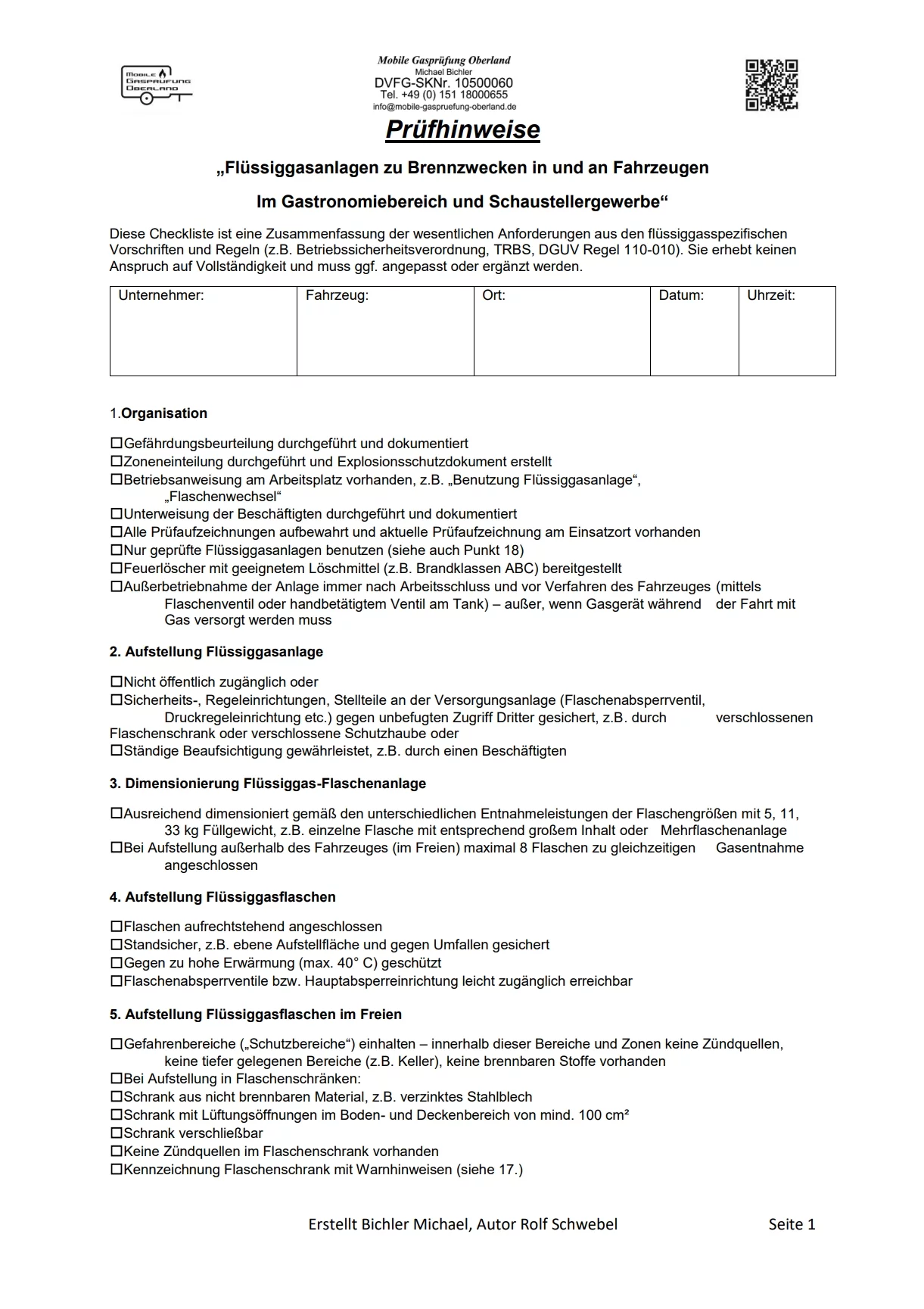 Nur eine „zur Prüfung befähigte Person“ darf die Prüfung Ihrer Flüssiggasanlage durchführen. Stellen Sie sicher, dass die zur Prüfung befähigte Person (Prüfer), die Sie beauftragen, auch die Anforderungen zur Prüfung von Flüssiggasanlagen in Ihrer Branche erfüllt (Rechtsgrundlage mit den Anforderungen, siehe unten).